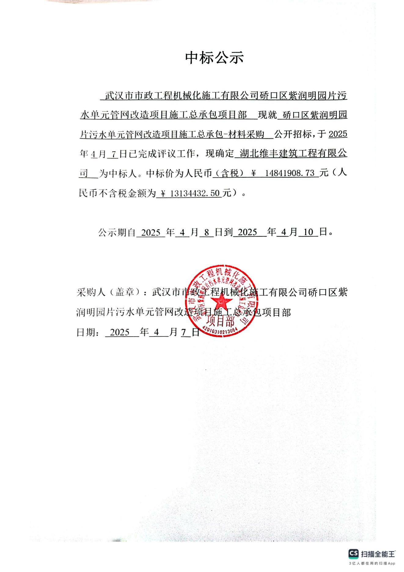 硚口區(qū)紫潤(rùn)明園片污水單元管網(wǎng)改造項(xiàng)目施工總承包-材料采購(gòu)中標(biāo)公示