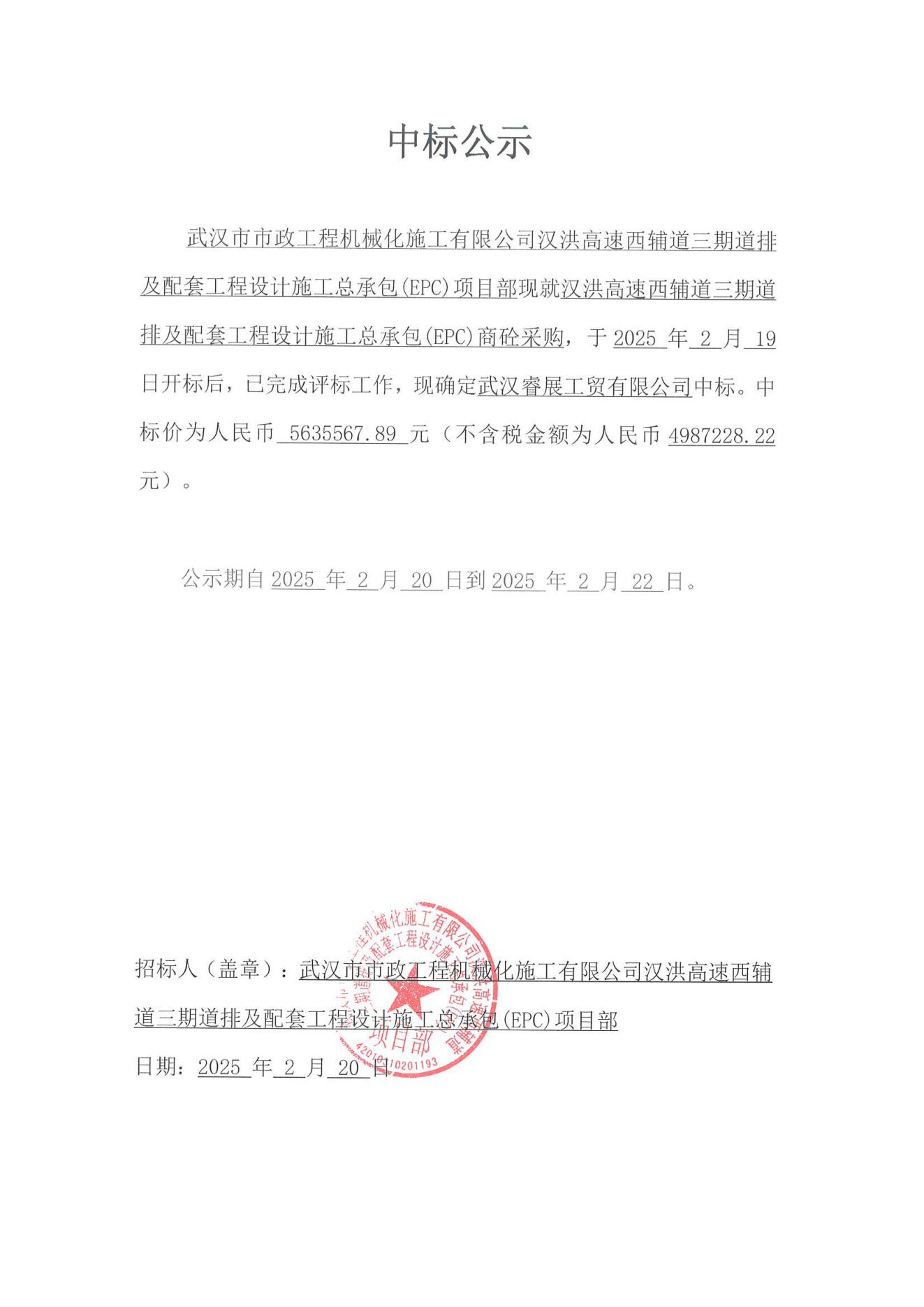 漢洪高速西輔道三期道排及配套工程設(shè)計施工總承包(EPC)商砼采購中標公示