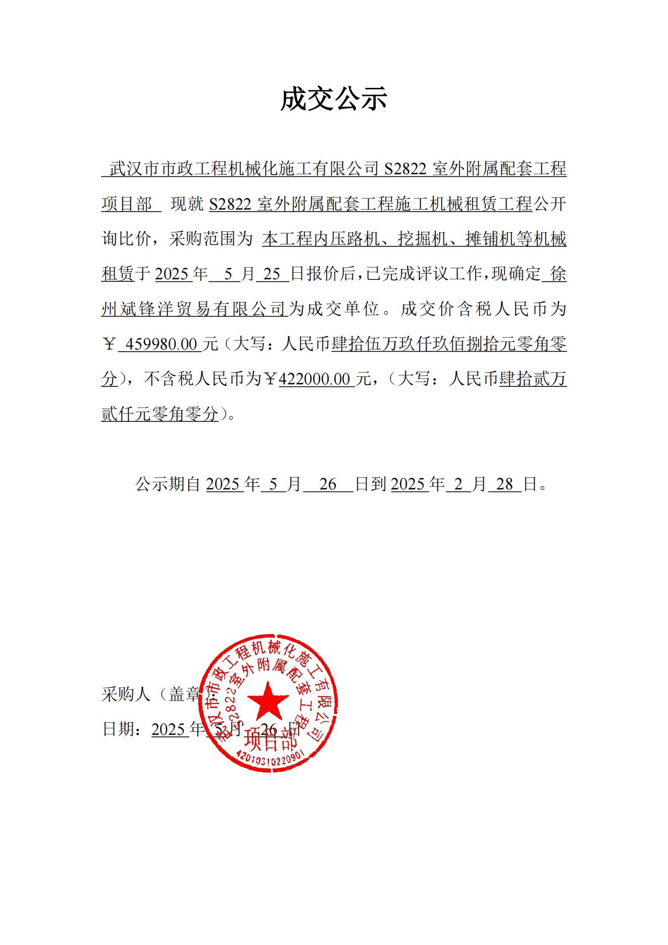S2822室外附屬配套工程施工機械租賃工程成交公示