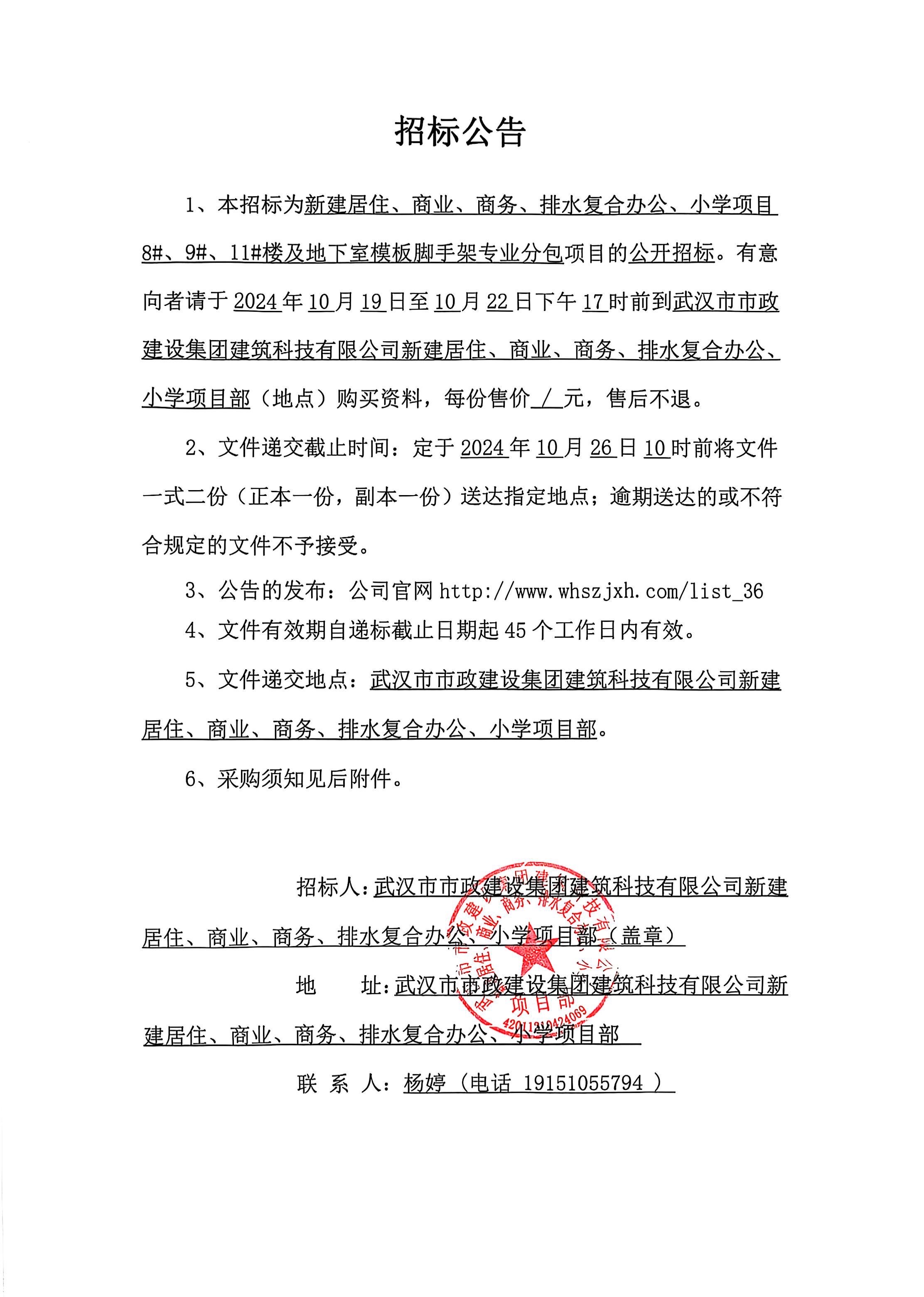 武漢市市政建設(shè)集團(tuán)建筑科技有限公司新建居住、商業(yè)、商務(wù)、排水復(fù)合辦公、小學(xué)項(xiàng)目8#、9#、11#樓及地下室模板腳手架專業(yè)分包招標(biāo)公告