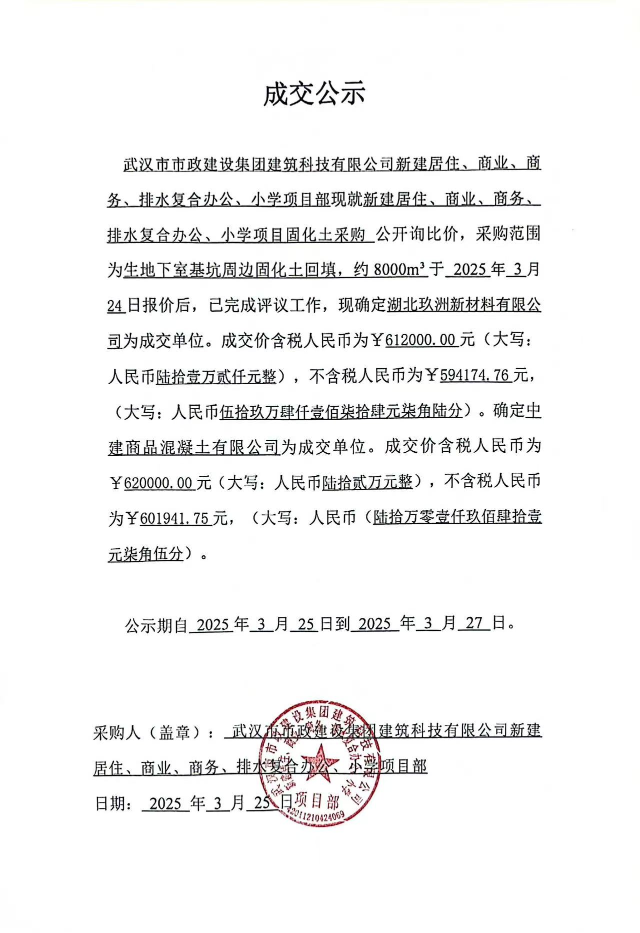 武漢市市政建設(shè)集團(tuán)建筑科技有限公司新建居住、商業(yè)、商務(wù)、排水復(fù)合辦公、小學(xué)項(xiàng)目固化土采購(gòu)成交公示