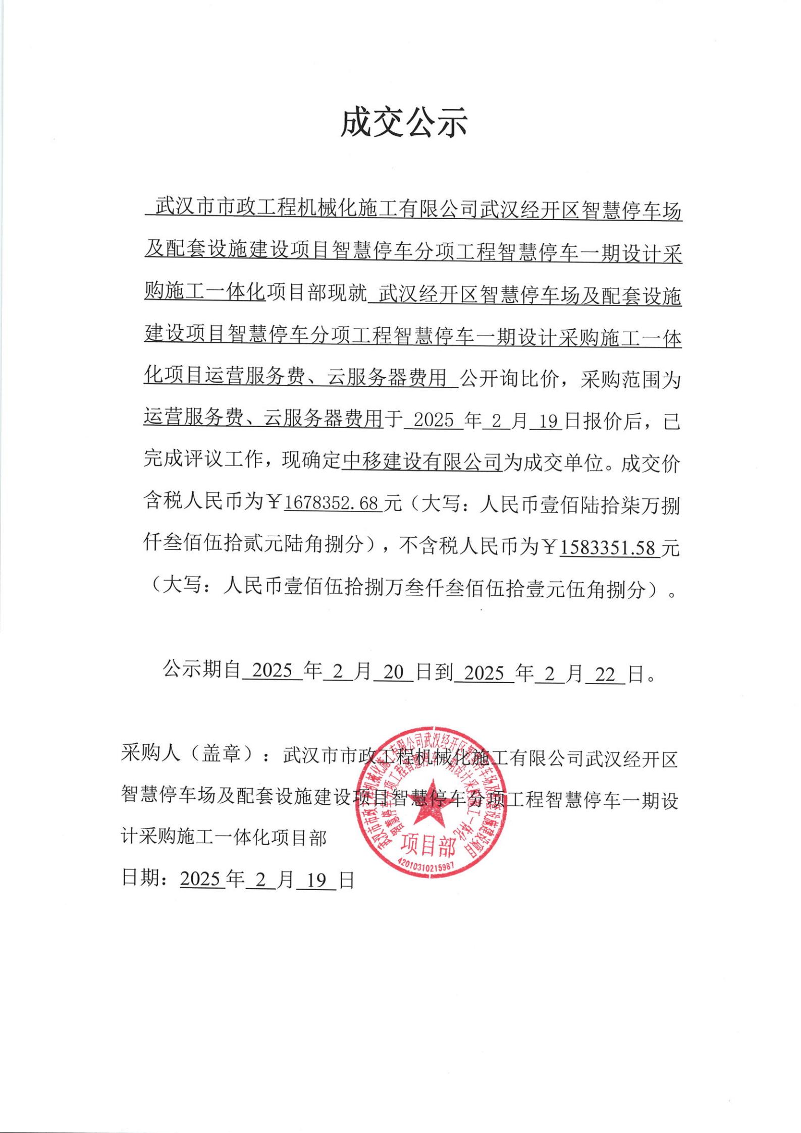 武漢經開區(qū)智慧停車場及配套設施建設項目智慧停車分項工程智慧停車一期設計采購施工一體化項目運營服務費、云服務器費用成交公示