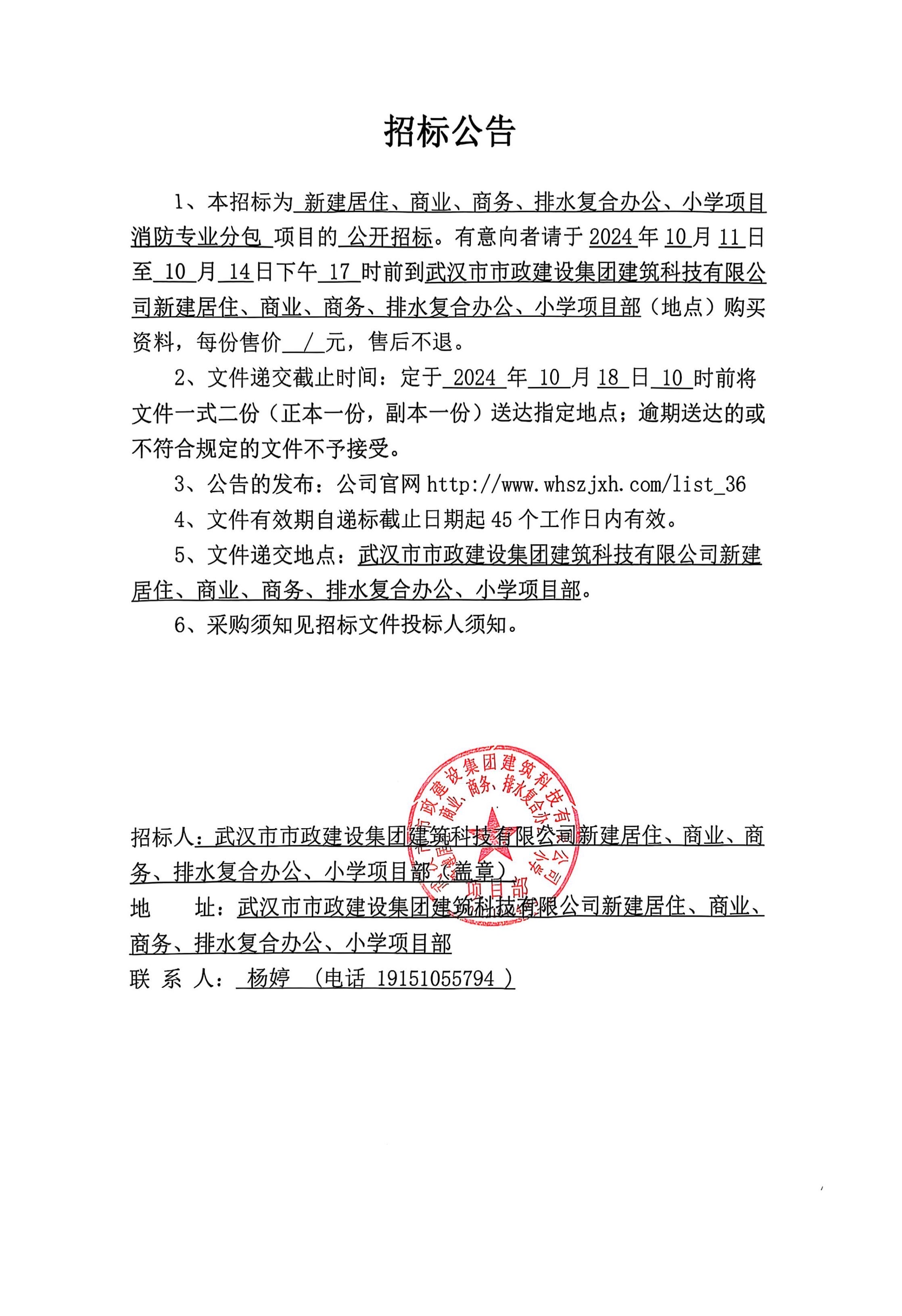 武漢市市政建設(shè)集團(tuán)建筑科技有限公司新建居住、商業(yè)、商務(wù)、排水復(fù)合辦公、小學(xué)項目消防專業(yè)分包招標(biāo)公告