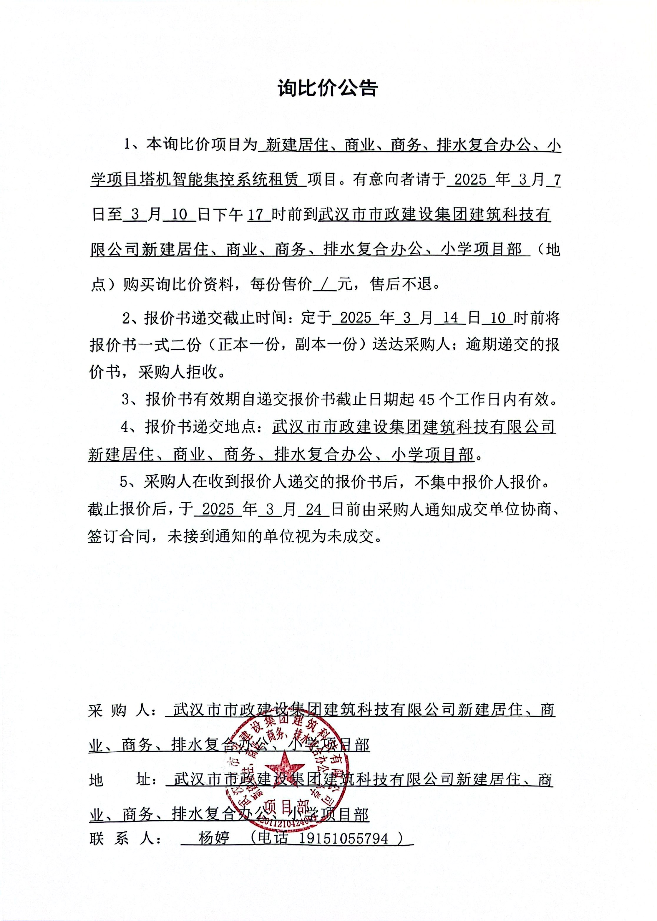 武漢市市政建設(shè)集團建筑科技有限公司新建居住、商業(yè)、商務(wù)、排水復(fù)合辦公、小學項目塔機智能集控系統(tǒng)租賃詢價公告