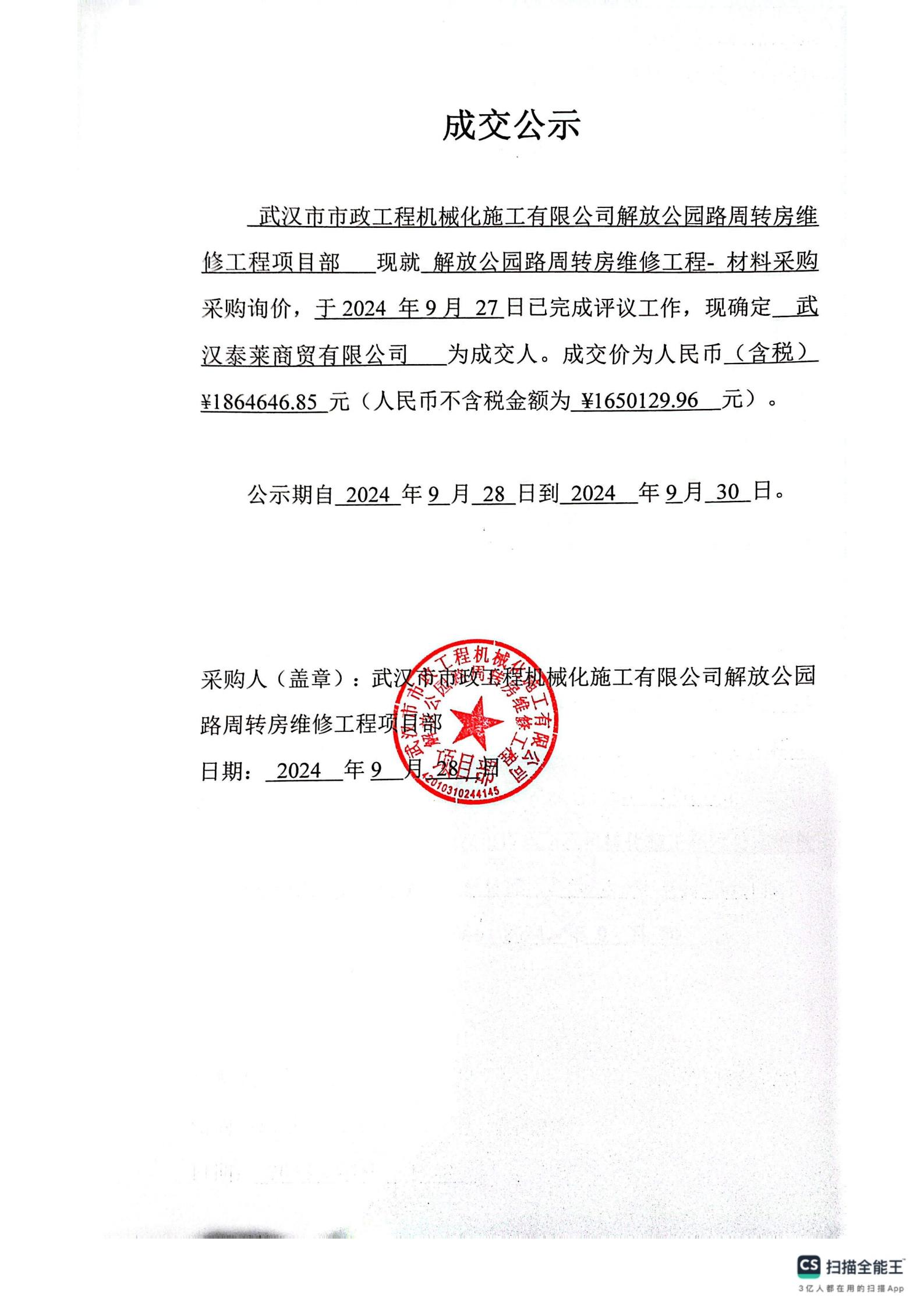 解放公園路周轉(zhuǎn)房維修工程-材料采購(gòu)成交公示