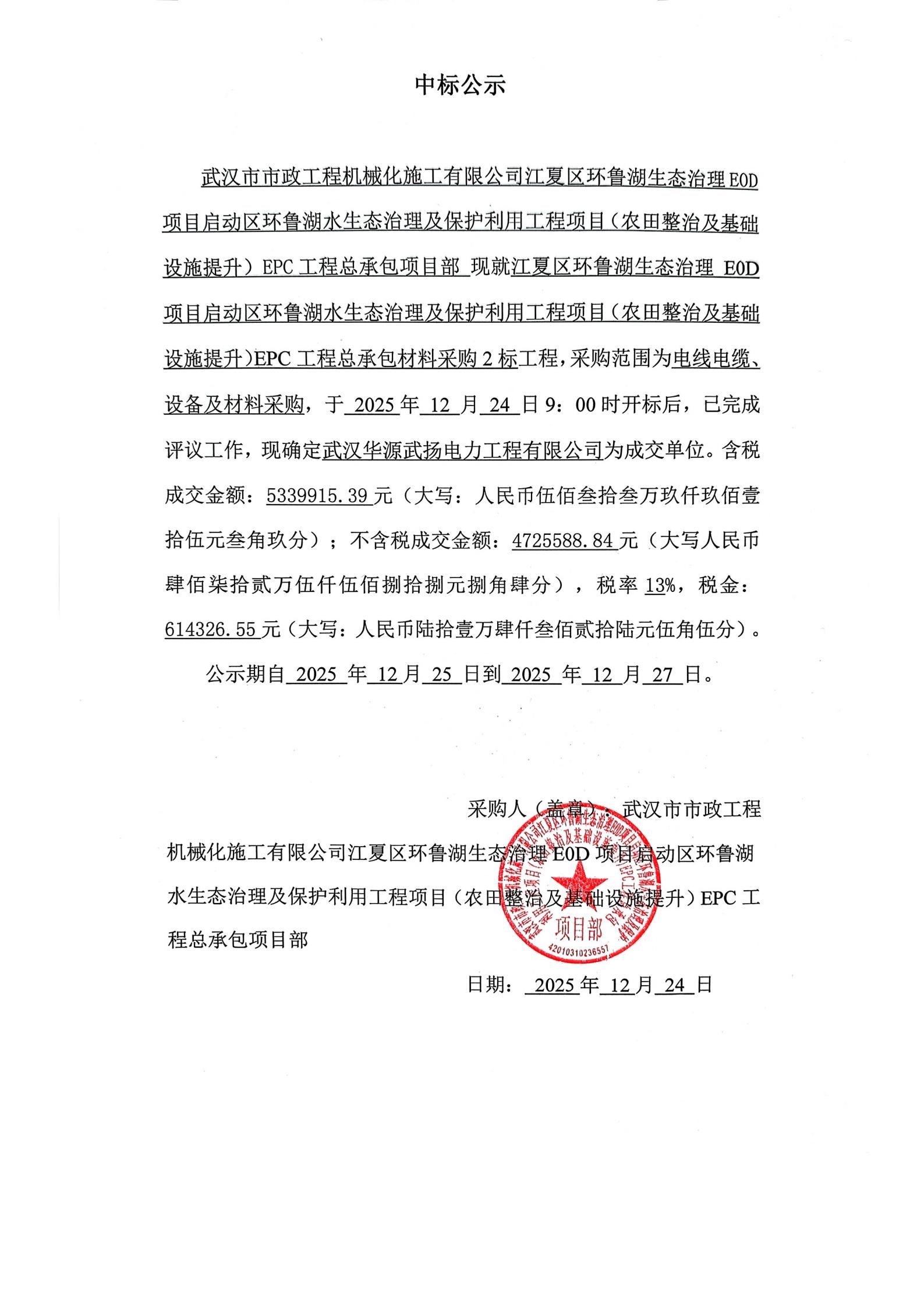 江夏區(qū)環(huán)魯湖生態(tài)治理 E0D 項(xiàng)目啟動(dòng)區(qū)環(huán)魯湖水生態(tài)治理及保護(hù)利用工程項(xiàng)目(農(nóng)田整治及基礎(chǔ)設(shè)施提升)EPC工程總承包材料采購(gòu)2標(biāo)中標(biāo)公示
