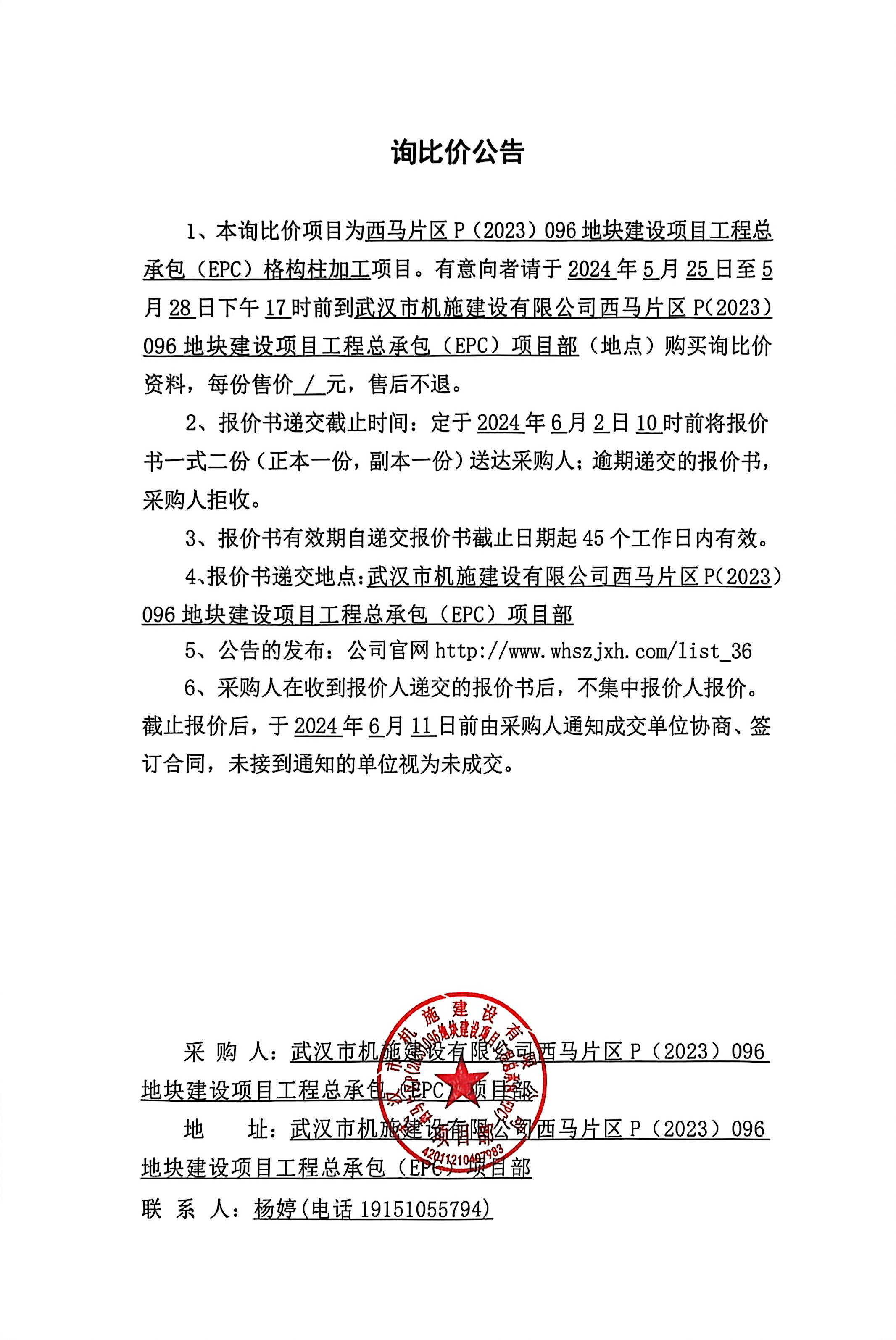 武漢市機(jī)施建設(shè)有限公司稱(chēng) 西馬片區(qū)P(2023)096 地塊建設(shè)項(xiàng)目工程總承包(EPC)格構(gòu)柱加工詢(xún)價(jià)公告