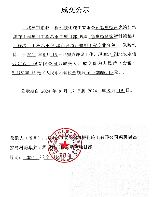慈惠街呂家灣村灣集并工程項(xiàng)目工程總承包-城市及道路照明工程專業(yè)分包詢價公告成交公示