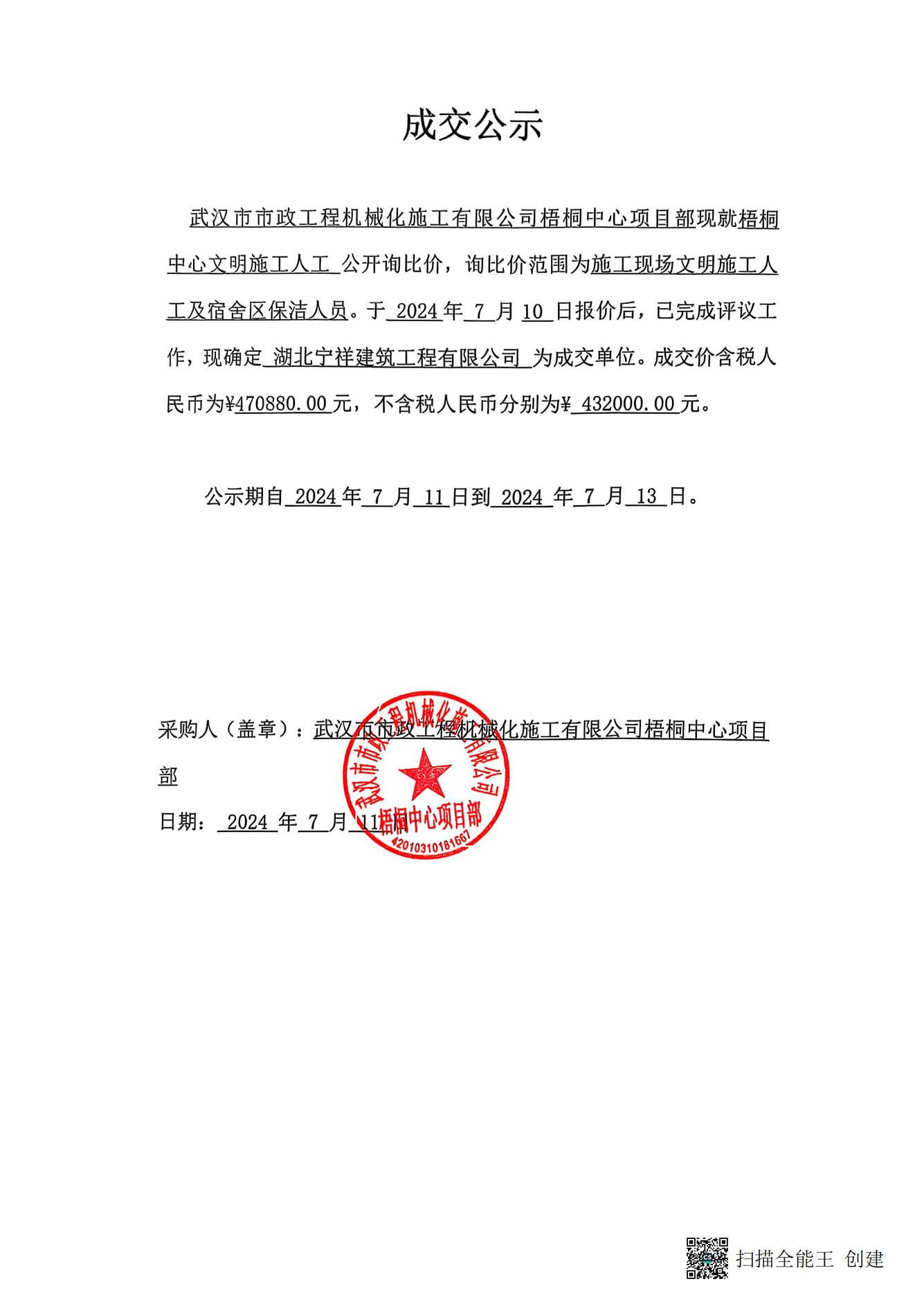 梧桐中心文明施工人工成交公示