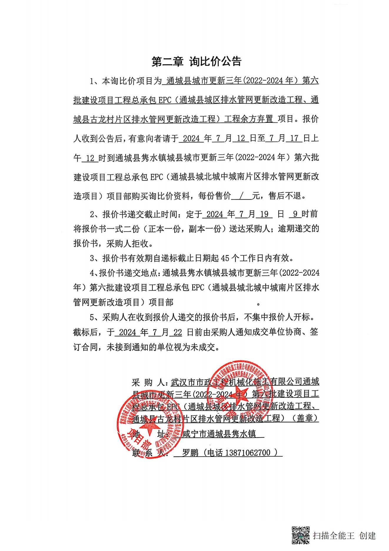 通城縣城市更新三年(2022-2024年)第六批建設項目工程總承包EPC(通城縣城區(qū)排水管網(wǎng)更新改造工程、通城縣古龍村片區(qū)排水管網(wǎng)更新改造工程)工程余方棄置采購詢價公告