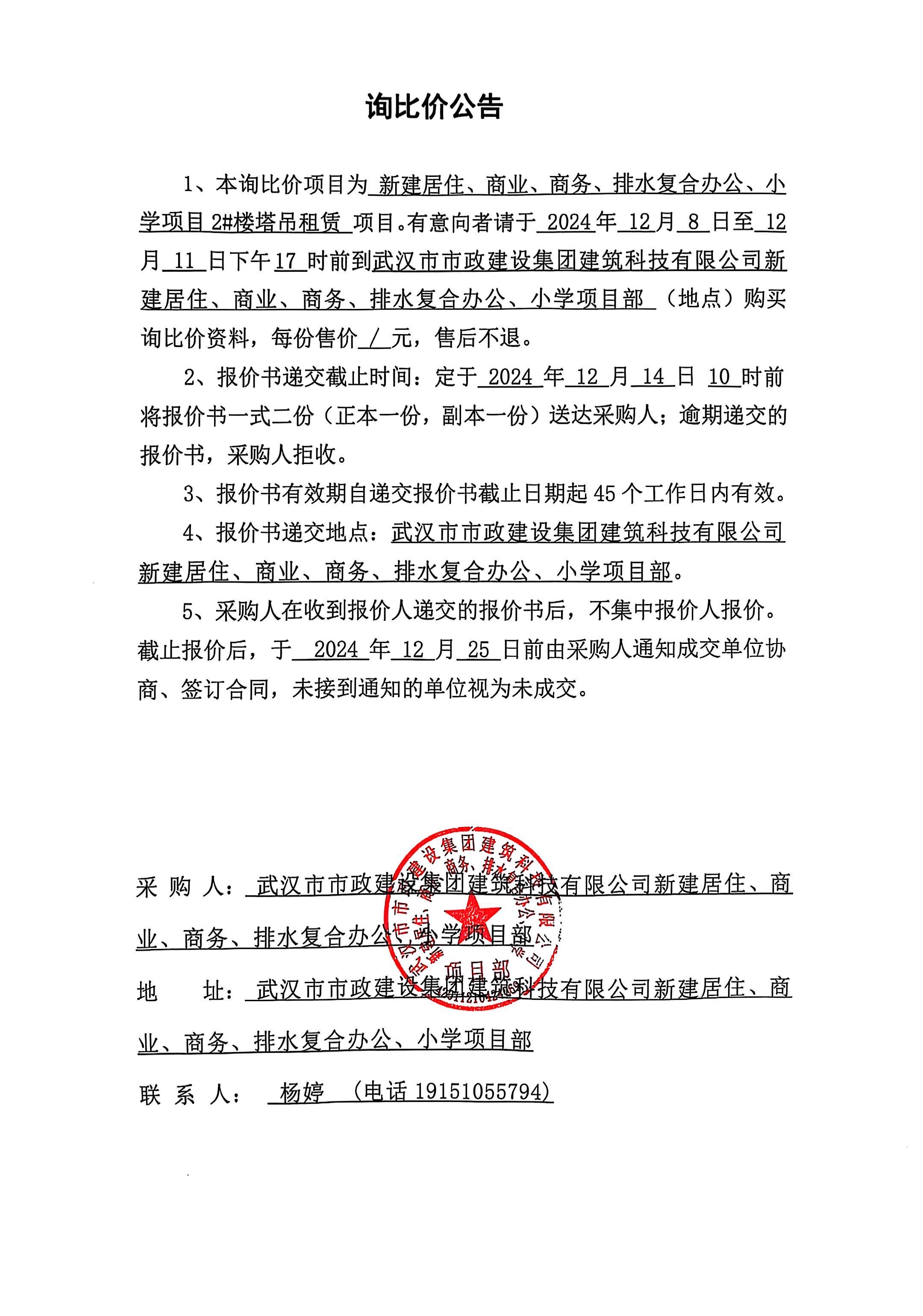 武漢市市政建設(shè)集團(tuán)建筑科技有限公司新建居住、商業(yè)、商務(wù)、排水復(fù)合辦公、小學(xué)項(xiàng)目2#樓塔吊租賃詢比價(jià)公告