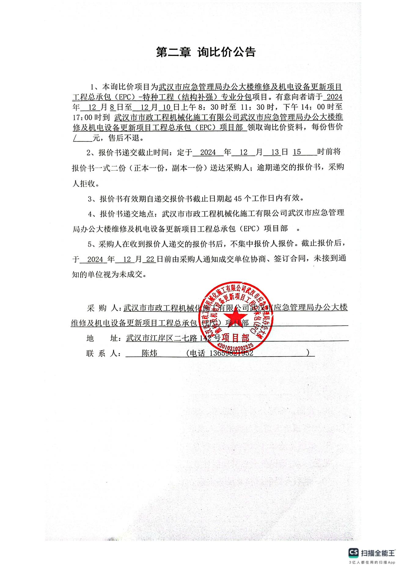武漢市應(yīng)急管理局辦公大樓維修及機(jī)電設(shè)備更新項(xiàng)目工程總承包(EPC) -特種工程(結(jié)構(gòu)補(bǔ)強(qiáng))專業(yè)分包詢價(jià)公告